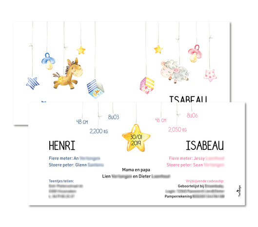Handgetekend geboortekaartje voor tweeling. Uiteraard is een eenling versie ook mogelijk.