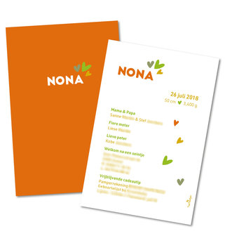 Geboortekaartje Nona Geboortekaartje Nona Achterkant Geboortekaartje Nona - Versie 2 Bijpassende kleuren Geboortekaartje Nona
