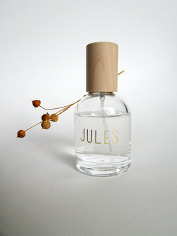 Kleur: transparant parfumflesje met gouden sprayer en houten dop